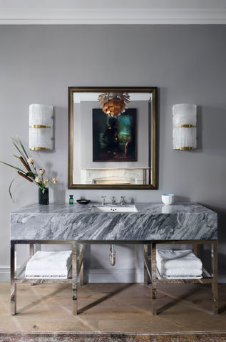 A slick, grey color palette gives the interior a dramatic and sophisticated feel.