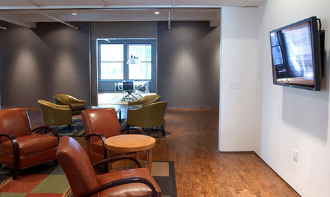 A vacant 3,500 square foot loft space is transformed into theatrically glamorous offices for an independent film company.